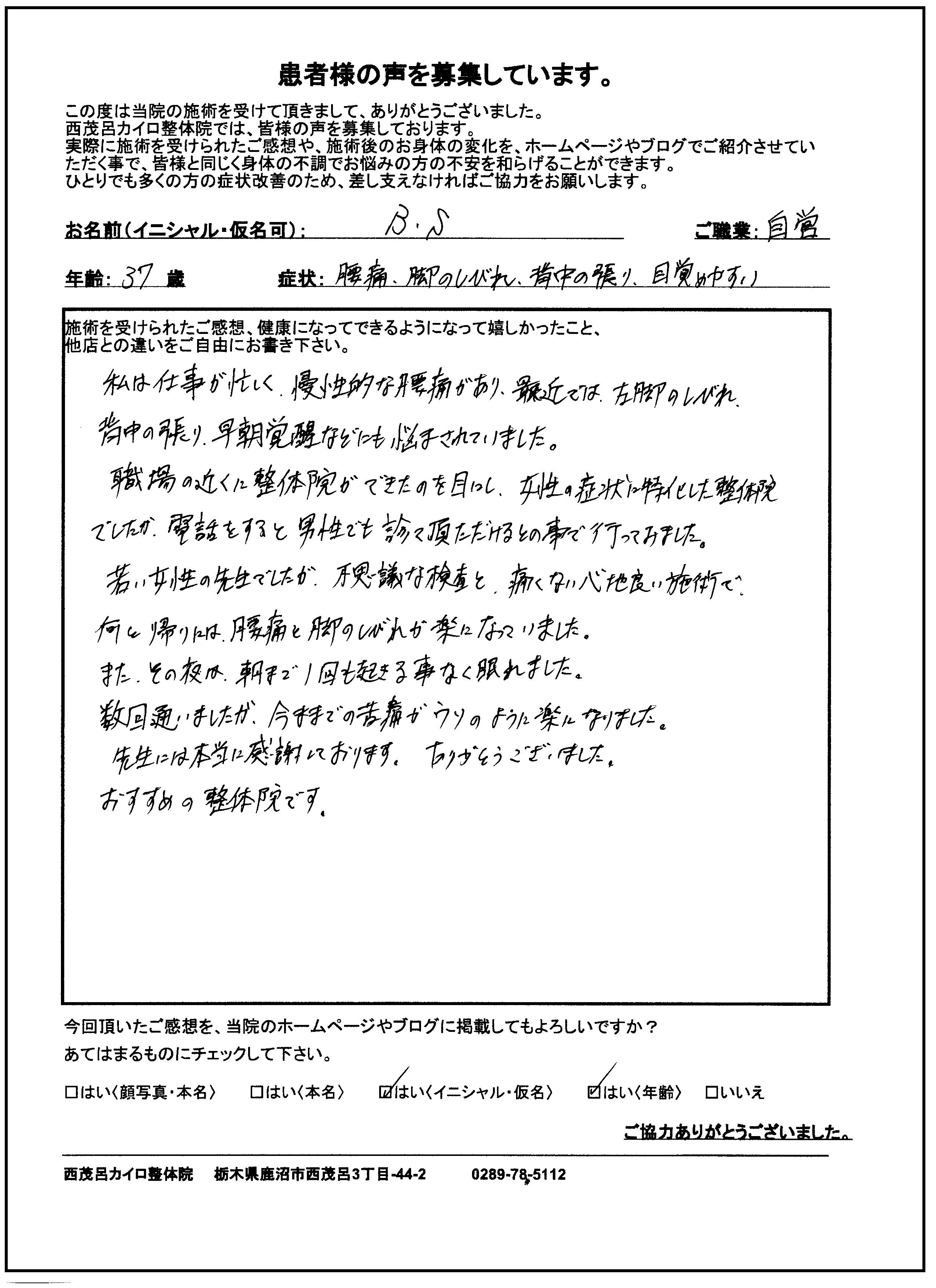 ●腰痛・脚のしびれ・背中の張り・目覚めやすい 鹿沼市 茂呂 30代 男性 B・Sさん