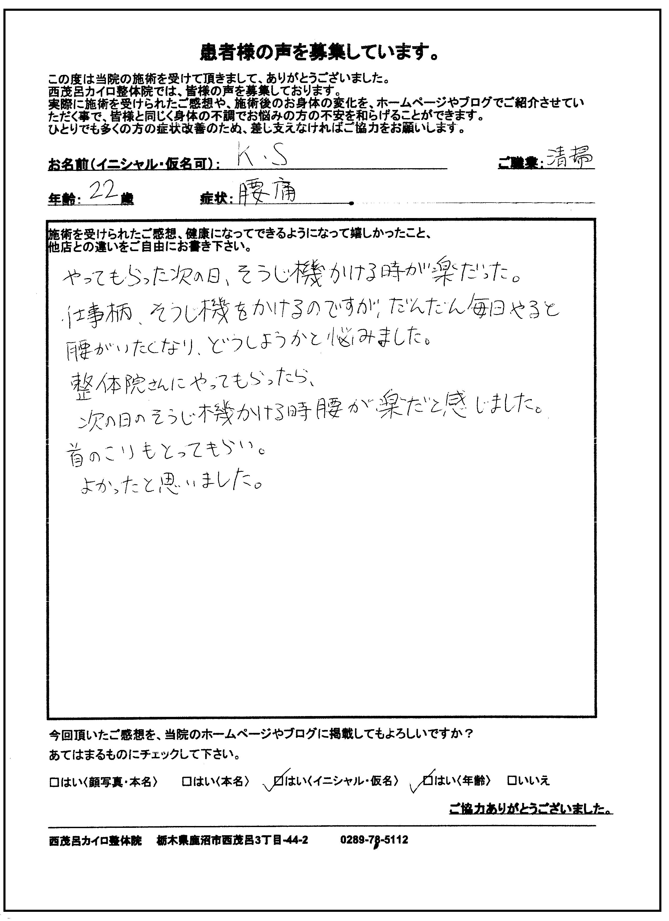 ●腰痛 宇都宮市 鶴田町 20代 女性 K.Sさん