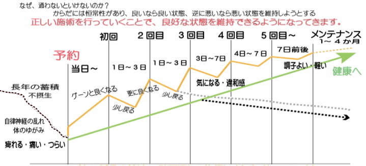 今までの蓄積によって身体が悪い状態を覚えています。施術により正しい状態に戻してもその状態を長く維持出来ません。施術を行っていくことにより身体が正しい状態を覚えます。